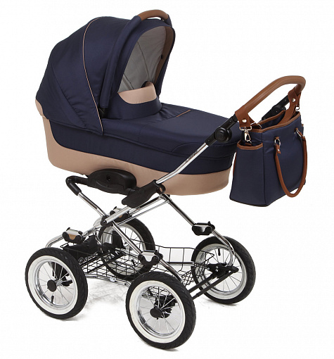 Wonderful stroller ძალიან თანამედროვე, მადლობა მაღალი ხარისხის ნაწარმი უგულებელყოფა მუქი ლურჯი და ყავისფერი ფერის, შესანიშნავად ერთად Chrome Frame ინვალიდის ეტლი. მილები მარტივად შეიძლება ამოღებულ ფარგლებში და გამოიყენება, როგორც rocking თავმჯდომარე ბავშვი.