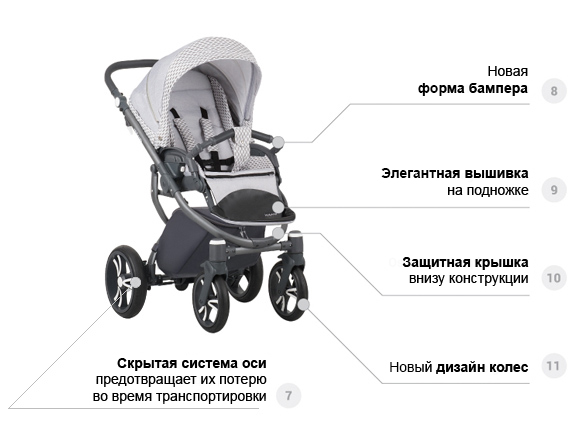 – თეთრი stroller შასის ძალიან შთამბეჭდავი და ჩანართები იყო პროდუქტი კიდევ უფრო დახვეწილი დისკები.