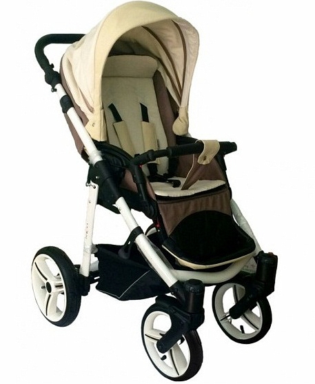 – ჩალისფერი ყავისფერი upholstery stroller «Nico» ჰარმონიული სახე თეთრი კარკასი შავი და დისკები.