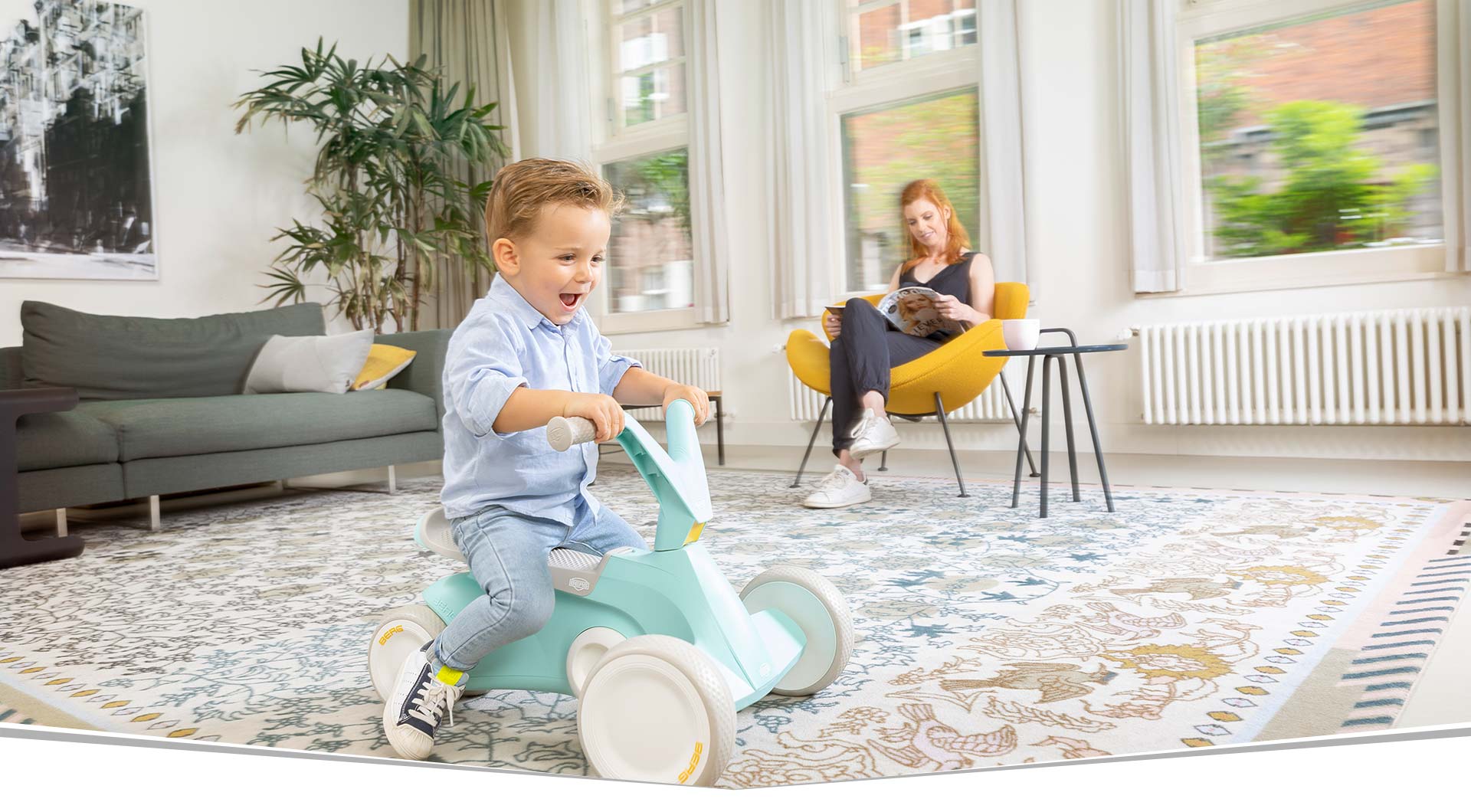 Go2 შესაფერისია ბავშვებისთვის 10 თვიდან 2.5 წლამდე. 2 1 რბოლაში ან ველოსიპედით.
