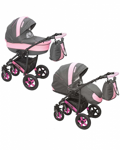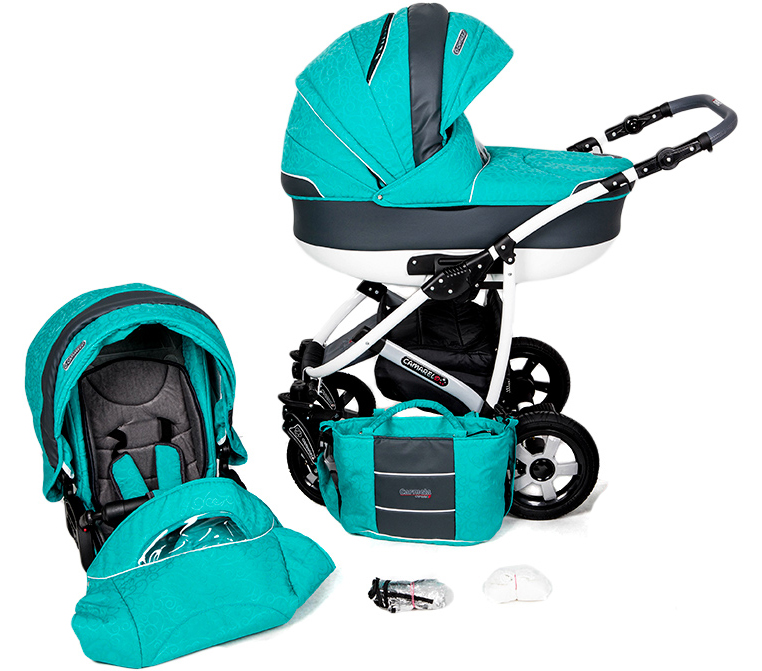 მოყვება: შასი + carrycot, ადგილს ერთეული, ლეიბები, აკვანი, თბილი საფარი ფეხით ადგილს ერთეული და carrycot, raincover, ჩანთა დედა, კალათა.