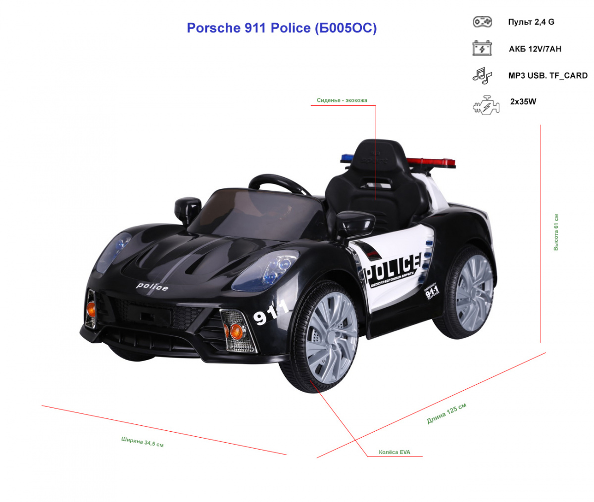 ელექტრო მანქანა Barty Porsche 911 Police B005OS შავი და თეთრი, განათება / ხმა, Barty, B005OS_cherno თეთრი.