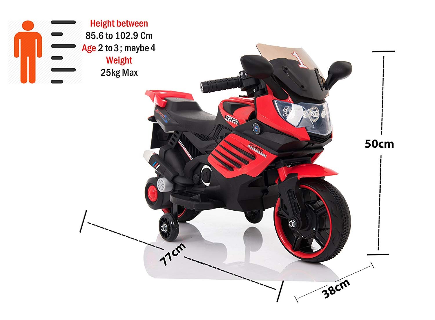 – მაქსიმალური სიჩქარეა 3 კმ / სთ, მხოლოდ 1 სიჩქარე წინ და 1 უკან, motobike იწყება ღილაკიდან, ხოლო აჩქარება ხორციელდება პედლების დაჭერით.