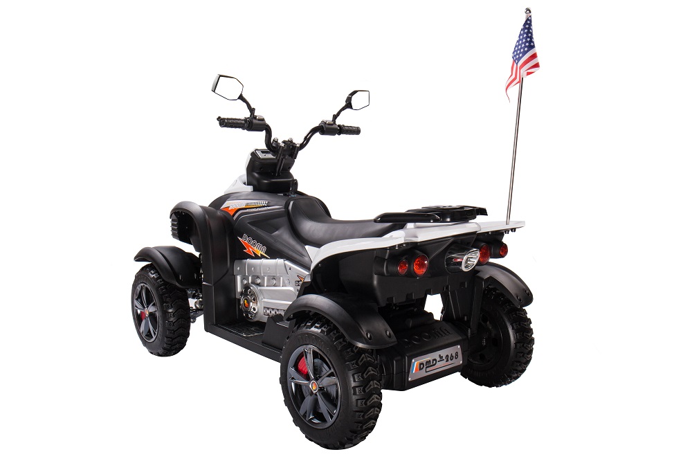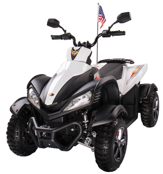 ეს რეალისტური თეთრი ელექტრო ATV არა მხოლოდ გარე იმეორებს ძლიერი მანქანა, მაგრამ ასევე აქვს მაღალი ჯვარი. ეს შესაძლებელია წყალობით გაიზარდა რეზინის დისკები, ყველა წამყვანი და რელიეფის საბურავები.