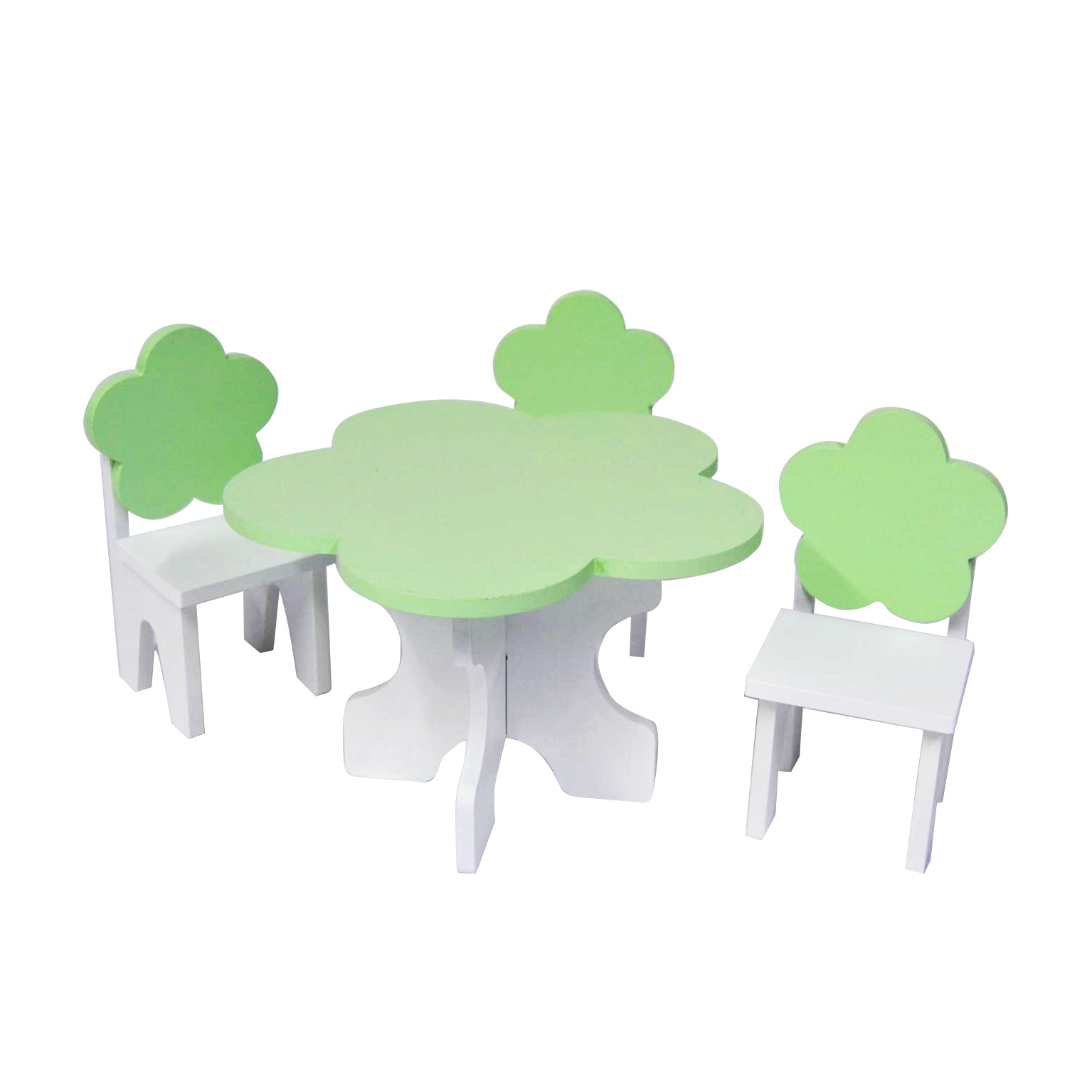 ავეჯის კომპლექტი თოჯინებისთვის – ყვავილი, მაგიდა და სკამები, თეთრი / ღია მწვანე