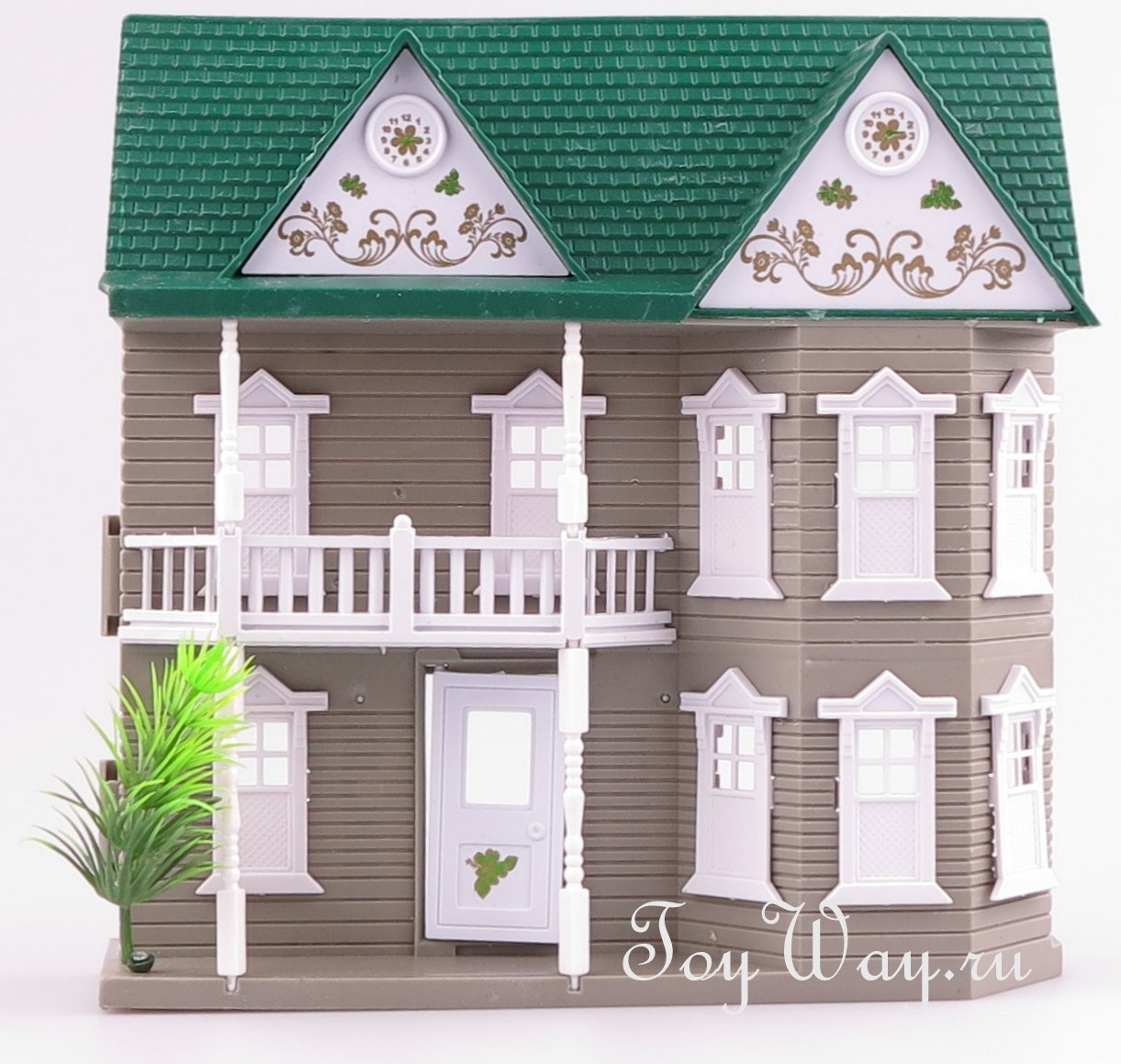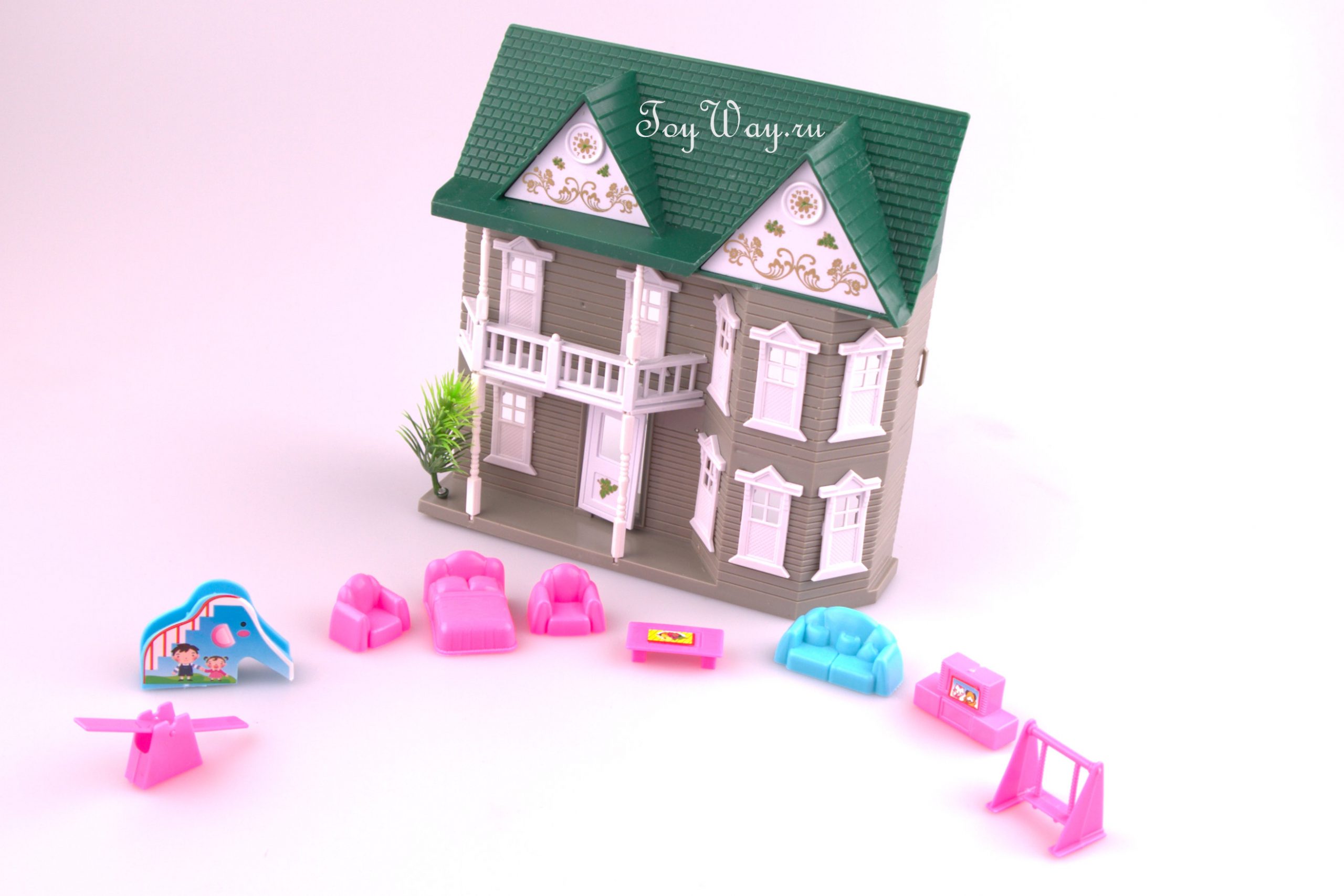 ორსართულიან სახლს აქვს ვარდისფერი სახურავი, ხოლო თამაშისთვის ის იყოფა ორ თანაბარ ნაწილად, რომელშიც არის ოთახი ავეჯით.