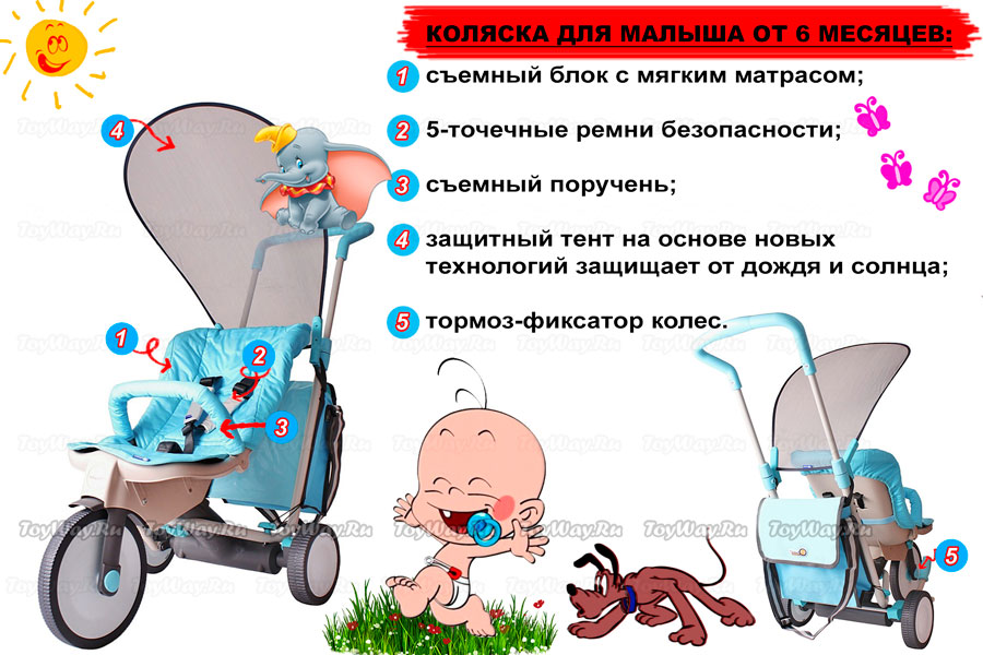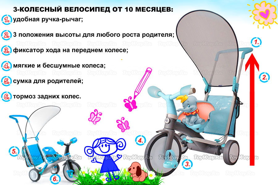10 თვიანი ასაკის ბავშვებისთვის – ტრიციკლი, რომლის სიმაღლე რეგულირდება მშობლის სახელური, წინა საჭეზე სამგზავრო საკეტი და მშობლებისთვის ჩანთა.