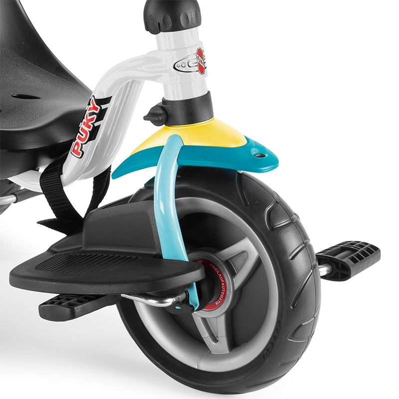 – ტრიციკლი, მისი ყველა ბორბალი საჰაერო ხომალდია რბილი PVC- სგან დამზადებული საბურავებით. წინა ბორბლს აქვს ზომა 22.5 სმ, უკანა ბორბლები დამზადებულია თითოეული 18 სმ-ით. თუ ბავშვი ჯერ კიდევ პატარაა და ვერ აღწევს პედლებს, მაშინ შეგიძლიათ განათავსოთ ისინი თავისუფალ პერსპექტივაში, და მოათავსეთ ფეხები სპეციალურ სტენდებზე, ასევე შესაძლებელია საჭესთან შეზღუდოს და მისი ბრუნვის კუთხე.